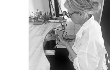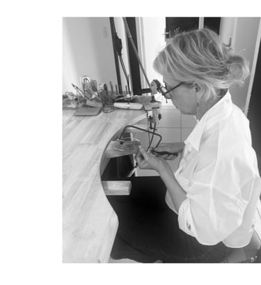 Aujourd'hui, elle crée des bijoux uniques, entièrement façonnés à la main, chaque pièce nait d'un serti en Argent ou en Cuivre , conçu dans son atelier, dans le lequel elle vient fondre à la flamme, du verre en baguette. ses créations sont des pièces uniques ou en série limitée, qui racontent une présence, une histoire et que l'on porte comme un trésor intime.
