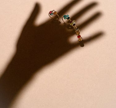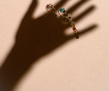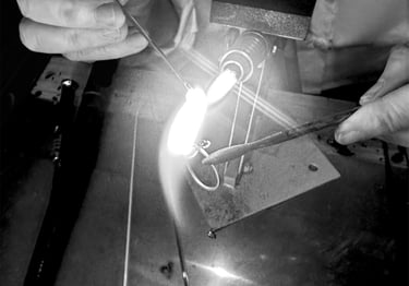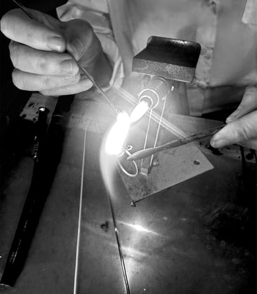 Sous la flamme, à la juste température, elle fond le verre directement dans le serti, là chaque geste compte, il faut lire la flamme, sentir le bon moment , trouver l'équilibre entre fusion et précision. le verre s'ancre dans le métal, s'y fixe. une alchimie fragile et unique.