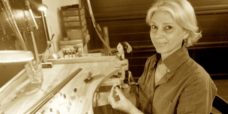 Dans son atelier, chaque bijou naît d' un dialogue entre le feu, la main et la matière .